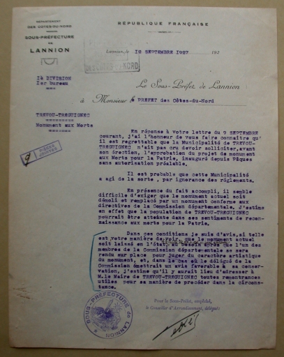 Courrier du sous-préfet de l'arrondissement de Lannion, daté du 12 septembre 1927, à l'attention du préfet des Côtes-du-Nord (AD 22)Immatriculation