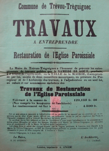 Annonce par voie d'affichage public de l'adjudication des travaux à entreprendre pour la restauration de l'église paroissiale de Trévou-Tréguignec, 3 août 1923 (AD 22)Immatriculation