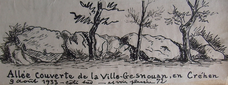 Créhen, la Ville-Génouhan. Allée couverte, côté sud, croquis du vicomte Henri Frotier de La Messelière, 9 août 1933 (AD 22)Immatriculation