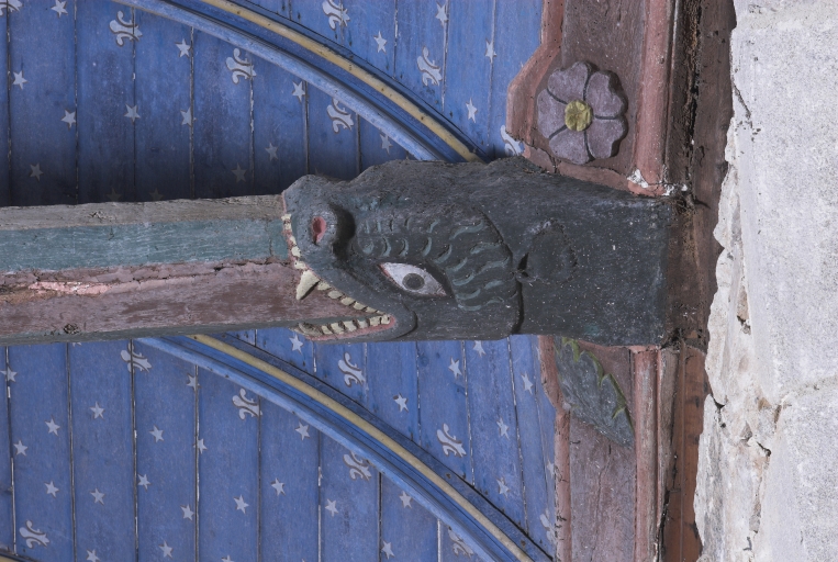 Bras sud, entrait : détail sculpté (engoulant)Immatriculation