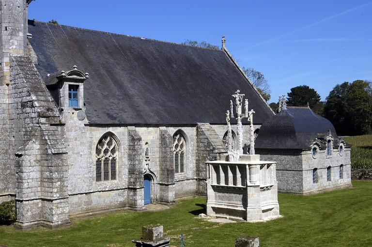 Vue générale de la chapelle et du calvaire (classement par arrêté du 9 mai 1914) ; la sacristie en arrière-planImmatriculation