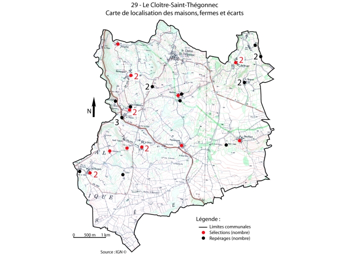 Maisons, fermes et hameaux sur la commune du Cloître Saint-Thégonnec,