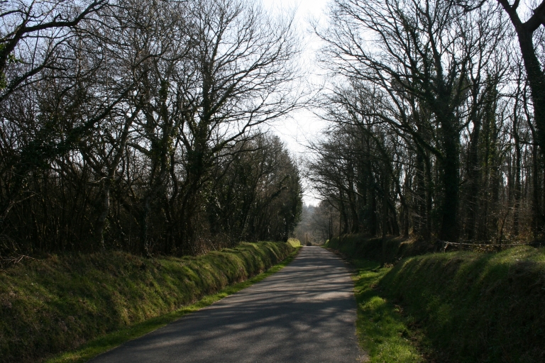Route bordée de talus, dans un boisement de feuillus, à proximité du menhir de KergollotImmatriculation