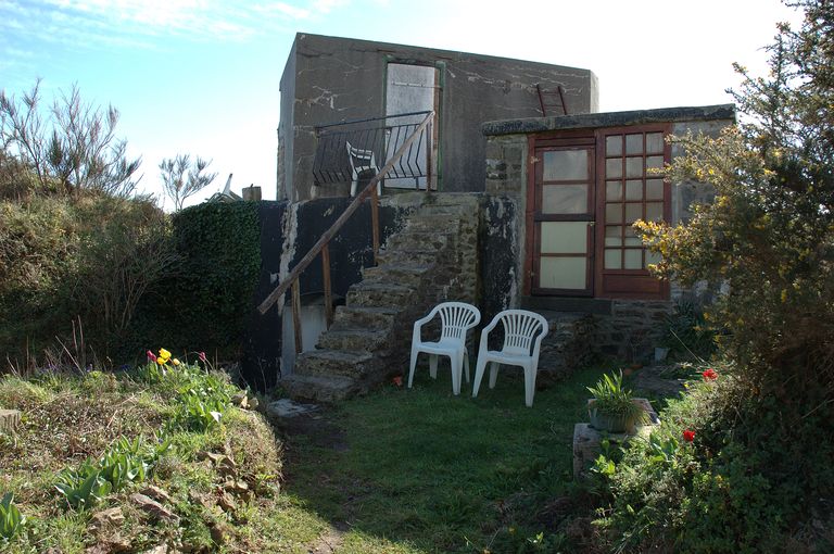 Vue de la batterie extérieure de 100 mm du Mengant : façade postérieure du poste d'observation en maçonnerie. Dalle de couverture bétonnéeImmatriculation