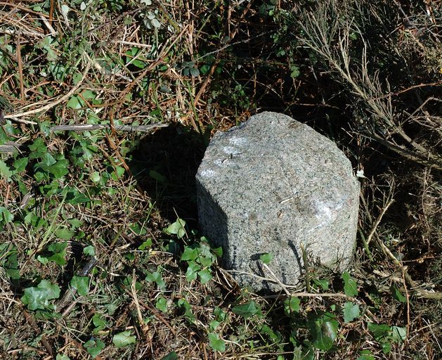 Vue de la batterie extérieure de 100 mm du Mengant : borne cadastrale en granite délimitant l'emprise du terrain militaireImmatriculation