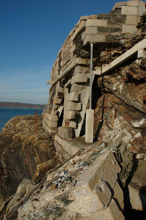 Vue de la batterie de Cornouaille : détail de l'escarpe (mur de soutènement de la batterie). Encadrement des créneaux, et cordon en granite ; remplissage en moellons de schiste (Travaux de stabilisation réalisés par la Direction des Travaux Maritimes)Immatriculation