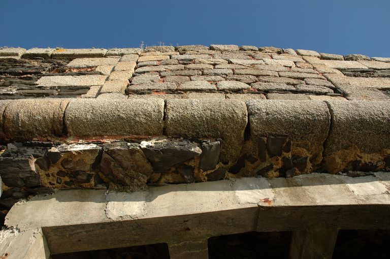 Vue de la batterie de Cornouaille : détail de l'escarpe (mur de soutènement de la batterie). Encadrement des créneaux, et cordon en granite ; remplissage en moellons de schiste (Travaux de stabilisation réalisés par la Direction des Travaux Maritimes)Immatriculation