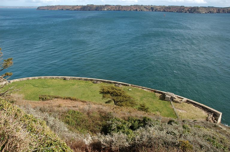 Vue générale de la batterie basse du Mengant depuis la batterie haute. En arrière plan : la côte de Cornouaille, presqu'île de Quélern, RoscanvelImmatriculation
