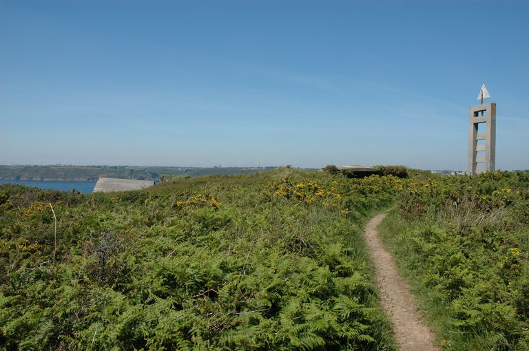 Vue de situation du poste de commandement de secteur de la pointe de Cornouaille. De gauche à droite : poste extérieur des torpilles, abri bétonné allemand, poste de commandement français et amerImmatriculation