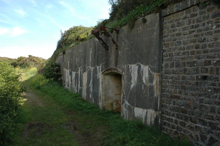 Vue de la batterie de gauche des Capucins : entrée du magasin à munitions en béton armé sous le massif de la traverse d'extrémité de gauche construit en 1898Immatriculation