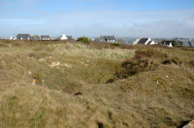 Vue du terrain situé à l'ouest du corps de garde de Penhoat : supports bétonnés pour canons antiaériensImmatriculation