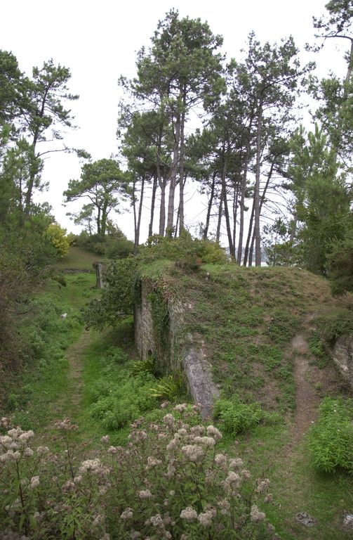Vue de la batterie de 4 canons de 95 mm de la pointe de Morgat ou Kador : traverses abris en maçonnerieImmatriculation