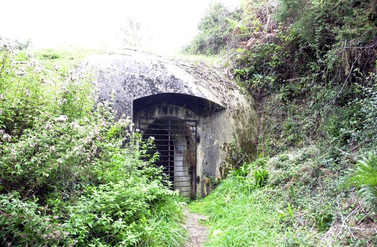 Vue de la batterie de 4 canons de 95 mm de la pointe de Morgat ou Kador : magasin à poudre sous roc construit en 1896 devenu réserve pour une colonie de chauves-sourisImmatriculation