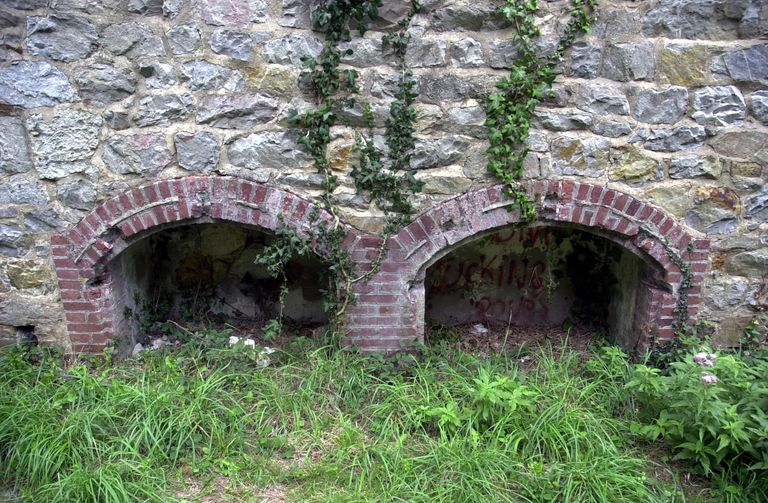 Vue de la batterie de 4 canons de 95 mm de la pointe de Morgat ou Kador : traverse abri centrale en maçonnerie, niches à munitions pour les coups de sûretéImmatriculation
