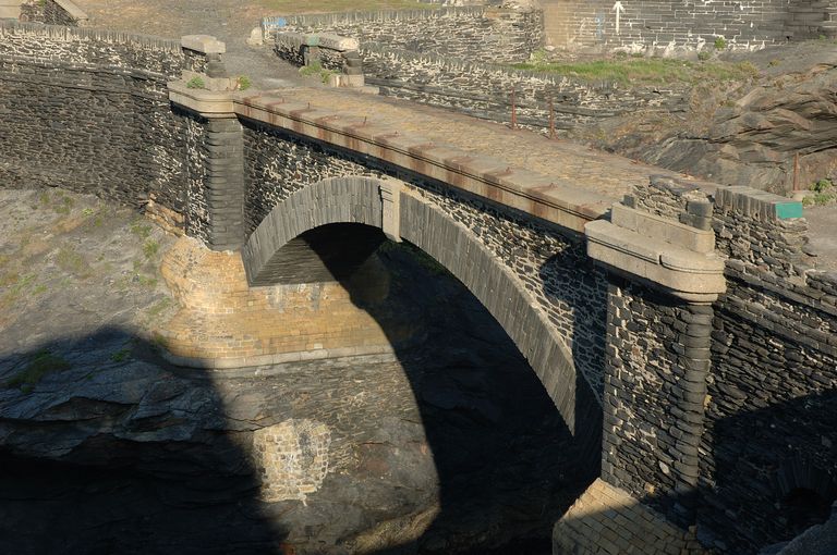 Vue du pont à une seule arche en appareil de schiste renforcé par une maçonnerie en grès de l'îlot des Capucins. Il porte au sud la date de 1861 et les lettres G M pour Génie MaritimeImmatriculation