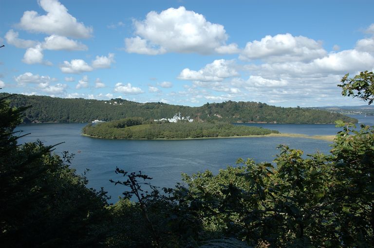 L'Aulne maritime : vue de l'île de Térénez à Rosnoën. Au mouillage dans l'anse de Penforn : le Colbert (croiseur de la marine nationale française entre 1956 et 1991)Immatriculation