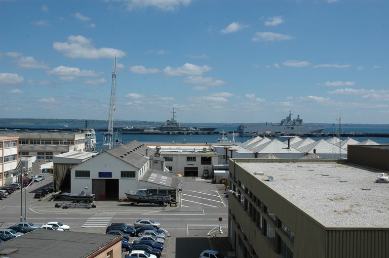 Vue de l'arsenal de Brest depuis la route de la Corniche : le porte avion Clémenceau (R98 : désarmé le 1er octobre 1997, en attente de démolition. Appelé Q-790 depuis 2002.) dans l'attente de son démantèlementImmatriculation