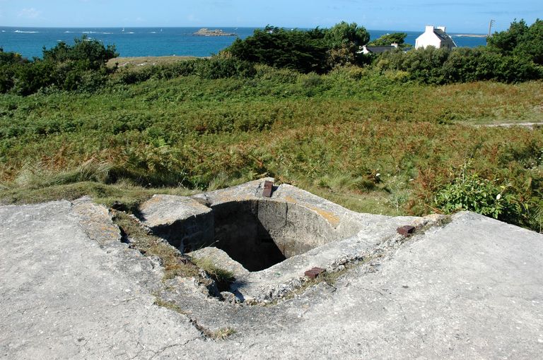 Vue de l'ensemble fortifié de Penn Enez : poste d'observation bétonné avec dalle de couverture en acier (ferraillé)Immatriculation