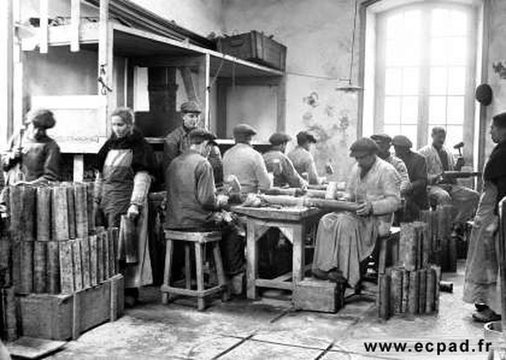 Guipavas : vue intérieure de l'usine pyrotechnique Saint-Nicolas, débossellement des douilles de 75 mm après usage, 11 mars 1916. Les douilles des obus sont reconditionnées pour être réutilisées. En pleine Guerre Mondiale, femmes de tout âge et hommes travaillent dans les ateliersImmatriculation