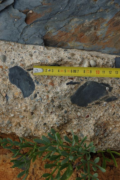 Vue des vestiges de la batterie nord de la Plage de Trez-Rouz. Maçonnerie en blocs de schiste et granite assemblés au mortierImmatriculation