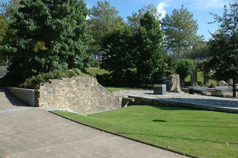 Vue des vestiges des fortifications d'agglomération de Brest dans le square Mathon : contrescarpe, fossé et chaussée de la porte de Saint-Louis percée en 1821 dans la demi-lune de Landerneau datant de la fin du 17e siècleImmatriculation