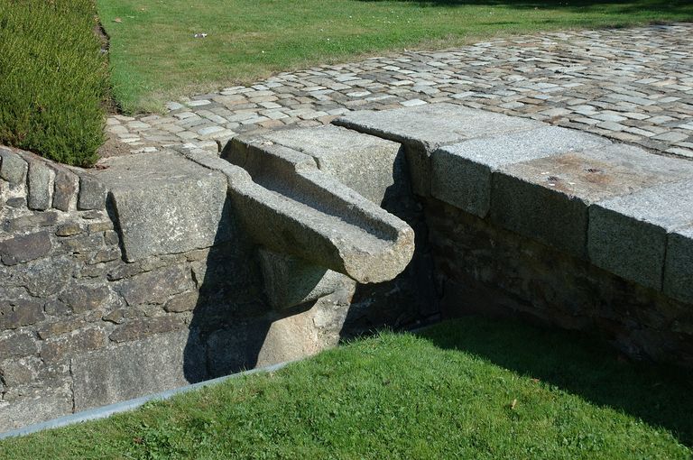 Vue des vestiges des fortifications d'agglomération de Brest dans le square Mathon : gargouille de la chaussée de la porte de Saint-Louis percée en 1821 dans la demi-lune de Landerneau datant de la fin du 17e siècleImmatriculation