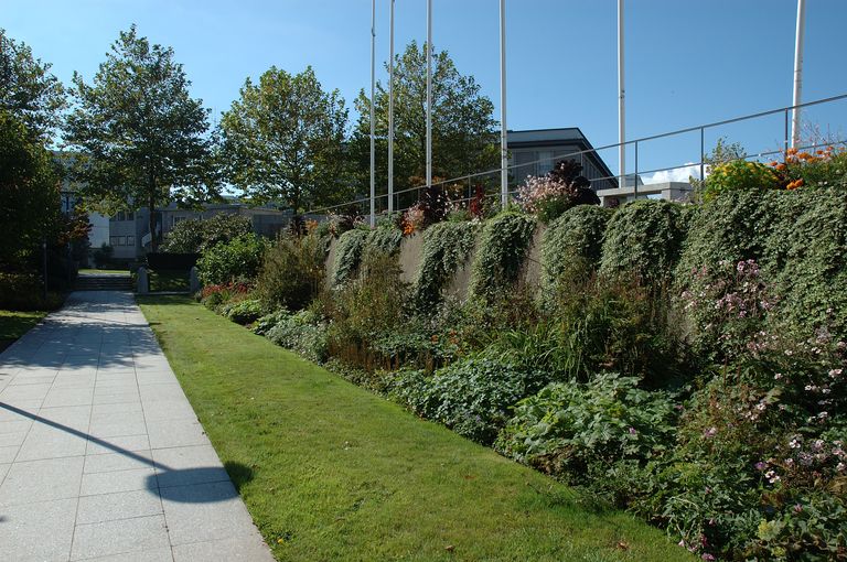 Vue des vestiges des fortifications d'agglomération de Brest dans le square Mathon : escarpe de la demi-lune de Landerneau datant de la fin du 17e siècle et porteImmatriculation