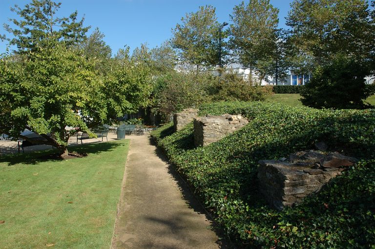 Vue des vestiges des fortifications d'agglomération de Brest dans le square Mathon : escarpe de la demi-lune de Landerneau datant de la fin du 17e siècle et porteImmatriculation