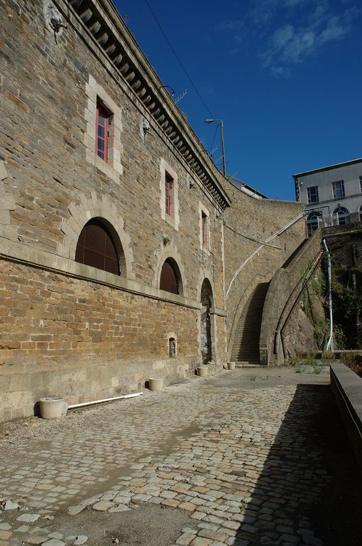 Vue de l'élévation orientale (contre-plongée) : chaussée - terrasse pavée, passage nord au niveau du rez-de-chaussée et baies en arc plein cintre. En arrière-plan, l'escalier des CapucinsImmatriculation