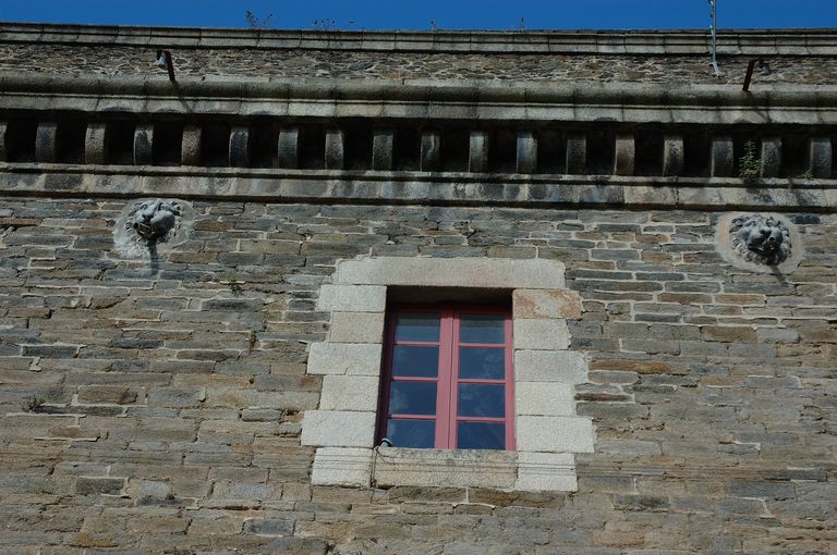 Détail de la façade orientale : corniche surmontée de réservoirs, gargouilles ornées de tête de lion et fenêtre rectangulaire du premier étageImmatriculation