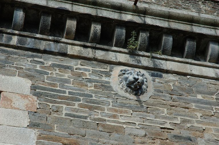 Détail de la façade orientale : l'une des dix gargouilles ornées de tête de lion et cornicheImmatriculation