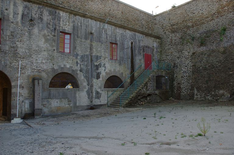 Vue de l'élévation occidentale : escalier extérieur sud donnant accès au premier étage. A droite, mur doté de contreforts donnant côté prison de PontaniouImmatriculation
