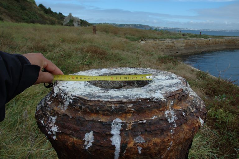 Crozon : vue de l'île des Morts en 2007, canon-bollard permettant de capeler l'oeil des amarresImmatriculation