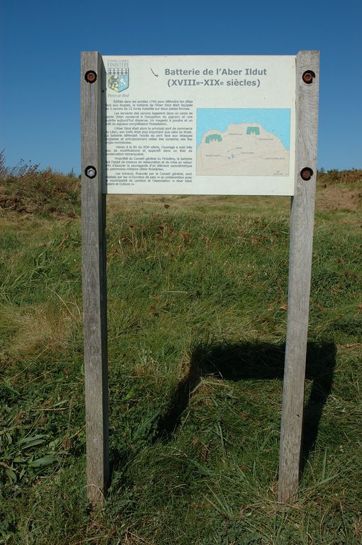 Vue de l'ensemble fortifié de Lanildut : signalétique en place sur la Batterie de l'Aber IldutImmatriculation