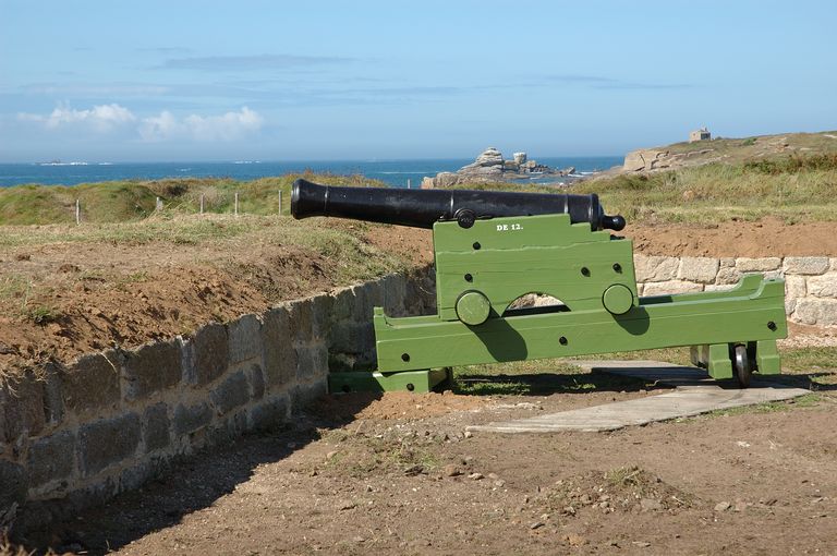 Vue de l'ensemble fortifié de Lanildut : reconstitution et mise en situation d'une pièce d'artillerie sur affût de la 2e moitié du 18e siècle (pièce de marine de 12 livres modèle 1786 de 1 610 kilogrammes coulée en 2007)Immatriculation