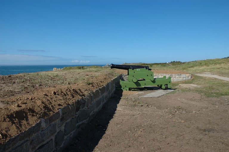 Vue de l'ensemble fortifié de Lanildut : reconstitution et mise en situation d'une pièce d'artillerie sur affût de la 2e moitié du 18e siècle (pièce de marine de 12 livres modèle 1786 de 1 610 kilogrammes coulée en 2007)Immatriculation