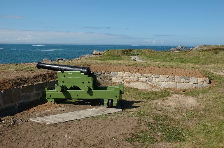 Vue de l'ensemble fortifié de Lanildut : reconstitution et mise en situation d'une pièce d'artillerie sur affût de la 2e moitié du 18e siècle (pièce de marine de 12 livres modèle 1786 de 1 610 kilogrammes coulée en 2007)Immatriculation