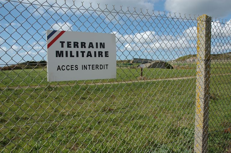Vue de la batterie de l'est dite batterie de gauche conçue pour 4 canons de 24 cm modèle 1870 : terrain militaire, signalétique en placeImmatriculation