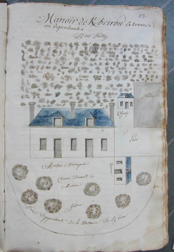 Métairie noble de Kerbérou. Dessin à la plume aquarellé, 1731 (A. D. Finistère, 41 H 5)Immatriculation