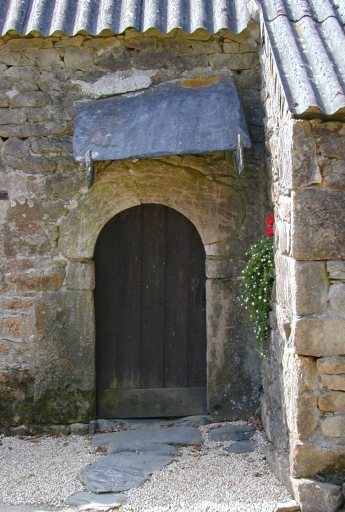 2. Ferme repérée de type logis-étable à deux portes avec avancée en rez-de-chaussée en appentis, limite 17e siècle 18e siècle. Détail de la porte et du auvent. Section B parcelle 640.Immatriculation
