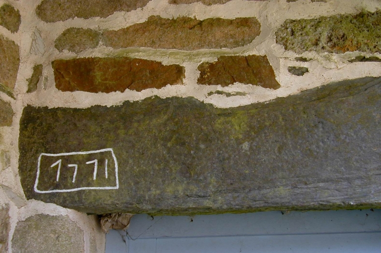 6. Maison repérée, 1771. Avancée en pignon à comble à surcroît rajoutée postérieurement. Détail du linteau. Section B parcelle 651Immatriculation