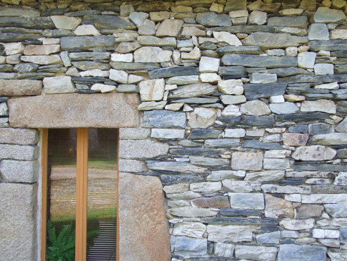 Détail de mise en oeuvre mixte associant schiste, grès quartzite et granite pour les encadrements des baiesImmatriculation