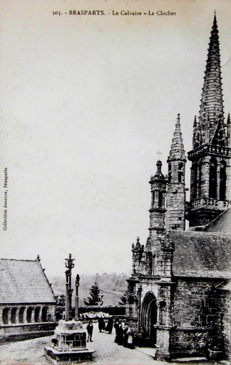 Ossuaire, calvaire et vue partielle de l'église. Carte postale, vers 1900 (A.D. Finistère, 2 Fi 16)Immatriculation