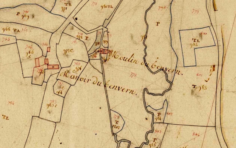 Benvern : le manoir et le moulin en 1812. Extrait du plan cadastral, section F 4 (A.D. Finistère, 3 P 19)Immatriculation