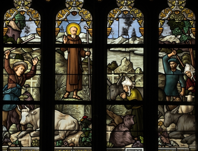 Ensemble des verrières à personnages des baies 0 à 3, 6, 8, 100 : Communion de la Vierge, Vierge, Saint Joseph, Scènes de la vie de saint Suliac,