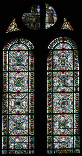 Ensemble des verrières à personnages des baies 0 à 3, 6, 8, 100 : Communion de la Vierge, Vierge, Saint Joseph, Scènes de la vie de saint Suliac,
