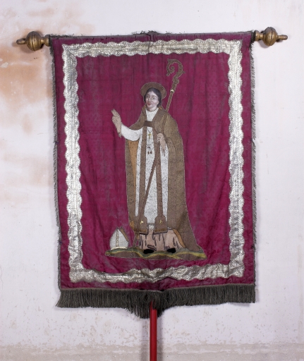 Bannière de procession paroissiale : Saint Erblon ou Herbland de Nantes, Christ en croix,