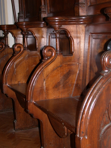 Décor de choeur : lambris de demi-revêtement, 2 bancs de choeur, 2x4 stalles, 2x3 stalles,