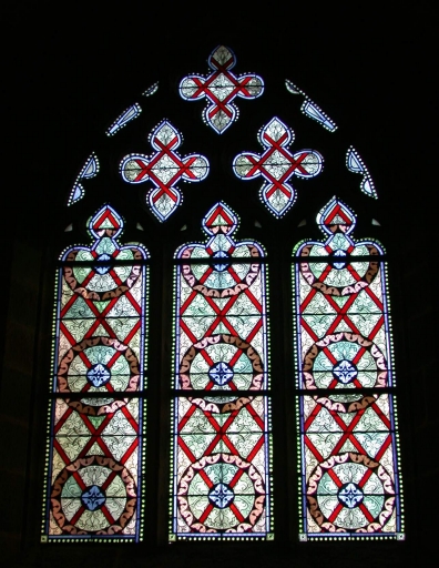 Verrière à personnages de la baie 0 : Saint Nicolas de Bari, Vierge à l'Enfant, Saint Joseph, Sainte Marie-Madeleine et verrières décoratives,