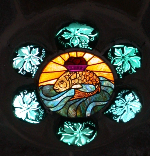 Verrière à personnages de la baie 0 : Saint Nicolas de Bari, Vierge à l'Enfant, Saint Joseph, Sainte Marie-Madeleine et verrières décoratives,